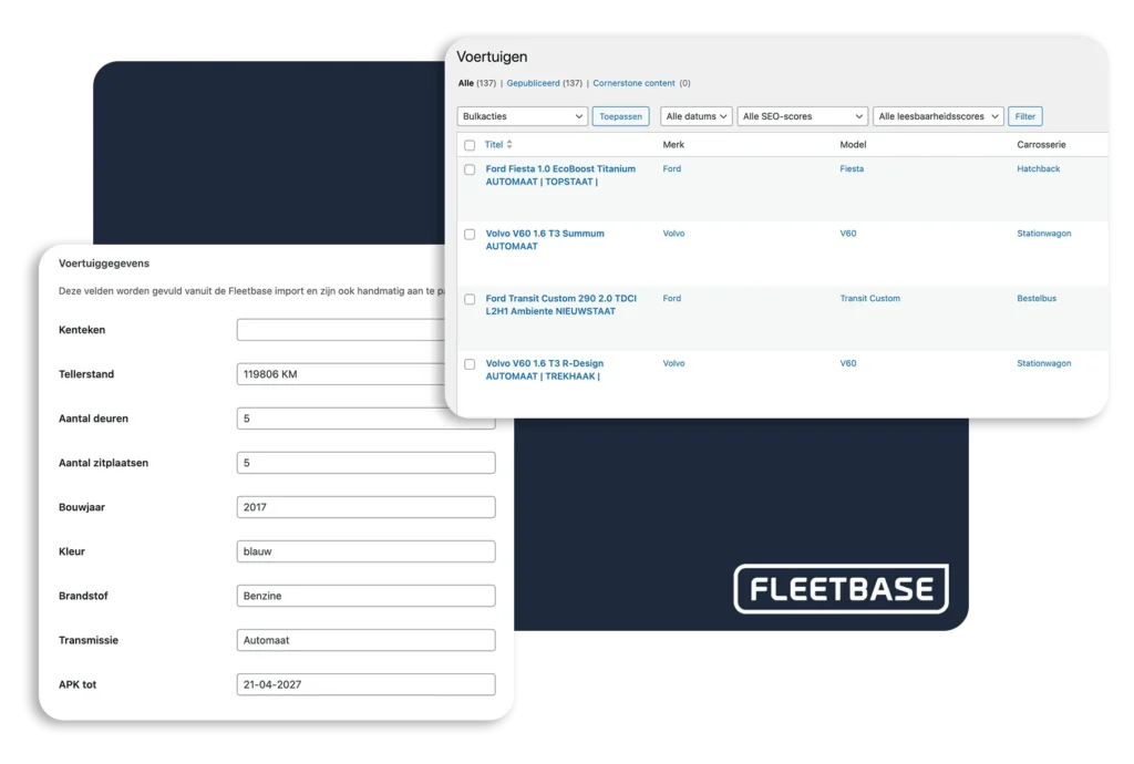 Met FLEETBASE heb je nooit meer omkijken naar het handmatig bijwerken van je website. Onze plugin creëert een directe koppeling tussen je voorraadbeheersysteem en je WordPress-site, waardoor elk nieuw voertuig, elke prijswijziging en elke statusupdate (zoals ‘verkocht’) binnen no-time wordt verwerkt.